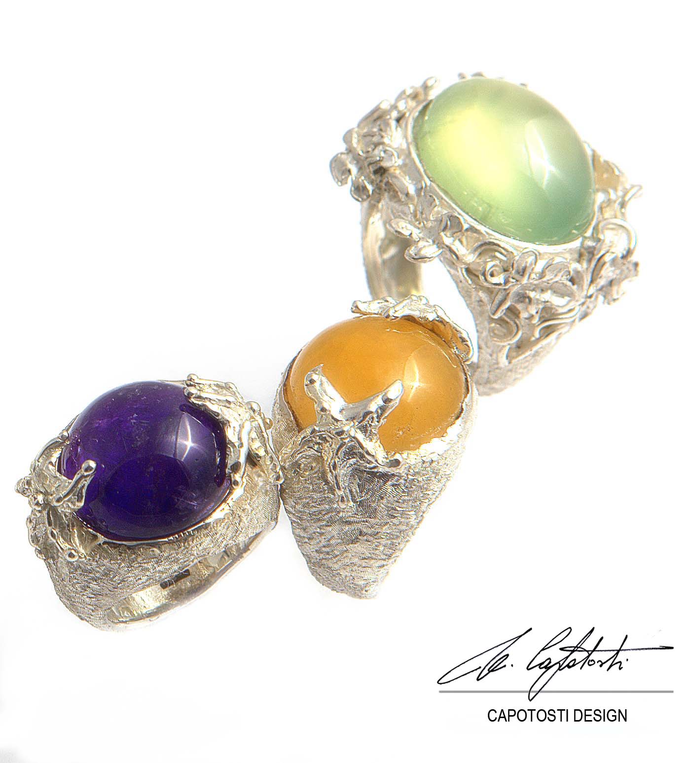 Gli anelli di Francesco Maria Capotosti tendono ad esaltare la sinuosità, la plasticità e l’originalità delle forme. Oggetti che aiutano ad accrescere il valore della femminilità di chi li indossa.