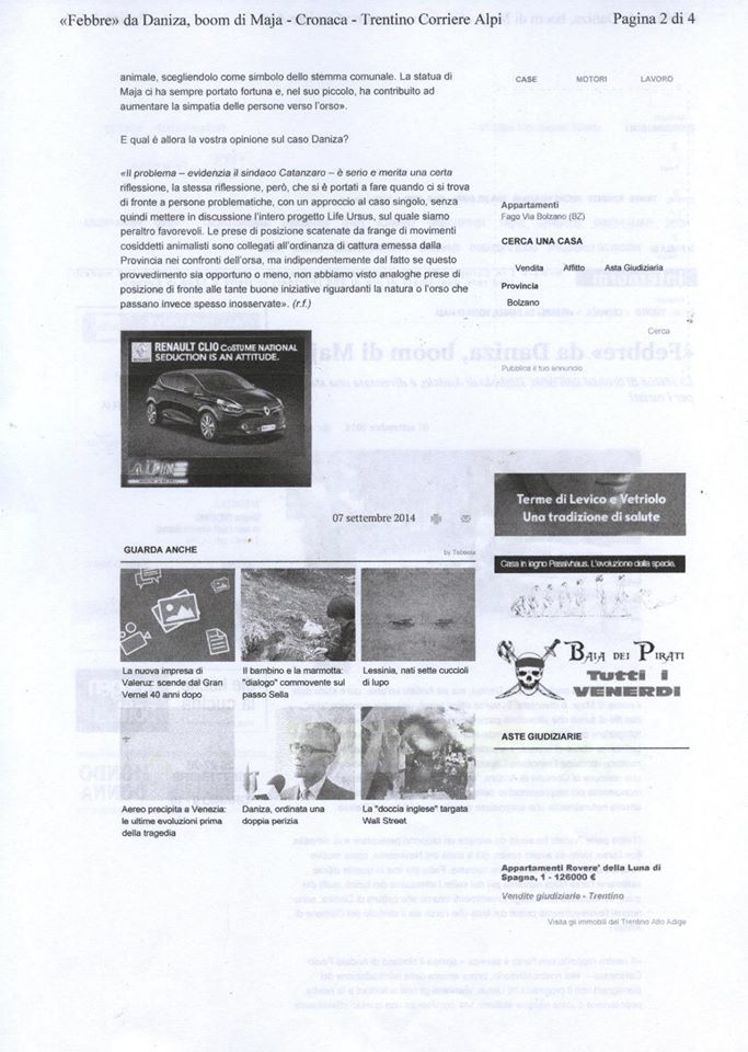 – Corriere delle Dolomiti, Trentino, 7 settembre 2014, “Febbre da Daniza, boom di Maya” (foto 1 – foto 2)