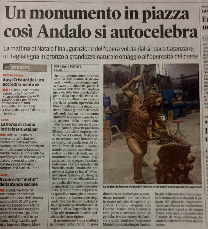 –Corriere delle Dolomiti, 23 dicembre 2014, “Un monumento in piazza così Andalo si autocelebra” (foto)