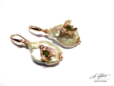 Orecchini della Collezione Ape Regina con api in argento 925/1000 dorate in oro rosa 750/1000 modellate a mano e realizzate con l’antica tecnica della cera persa, piccola agata verde cabochon e perle barocche naturali.