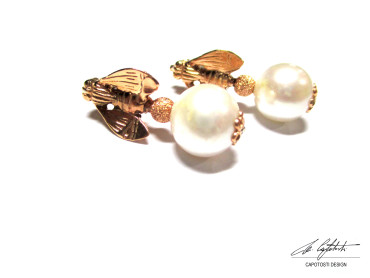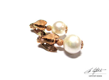 Orecchini della Collezione Ape Regina con api in argento 925/1000 dorate in oro rosa 750/1000, modellate a mano e realizzate con l’antica tecnica della cera persa e perle naturali.